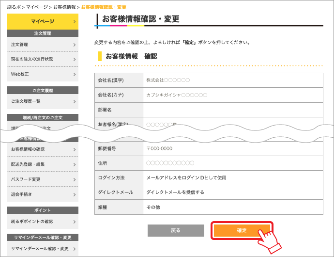 - 変更後の内容が表示されますので確認をしていただき、問題があれば 「戻る」 ボタンを、このままでよければ 「確定」 ボタンを押してください。